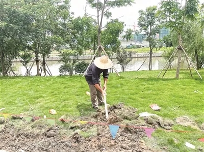 当天,有工人正扛起铁锹挖地,准备补栽草坪。“这条路上的草坪还没验收,一被压坏,我们就要来修补,就这个礼拜,已经连着补了好几天了。”一名施工方负责人满脸愁容,之前铺草坪时草皮的价格是一平方十几元,但现在要一平方四十多元,算上新草皮的费用和人工成本,又是一笔不小的花销。“不知道该找谁赔,这笔钱只能我们自己掏,损失太大了。”施工方负责人诉苦道。