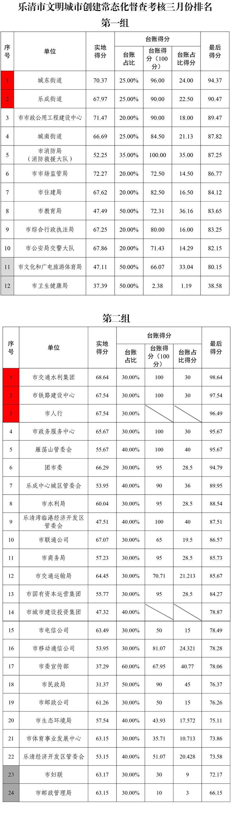 根据《2023年乐清市文明城市创建实地常态化督查考评办法》(乐创文〔2023〕1号)要求,2023年三月份市创建办对79个职能部门和25个乡镇(街道)开展实地测评和台账申报,发现的问题已通过《乐清市创建全国县级文明城市信息管理系统》进行反馈,请各责任单位举一反三抓好整改并按时反馈整改情况。督查考评按分组排名,排名靠前的予以红榜激励,排名靠后的予以黑榜惩戒,现将结果公布如下: