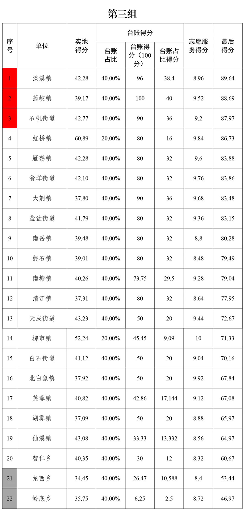 第三组:红榜乡镇为淡溪镇、蒲岐镇、石帆街道,黑榜乡镇为龙西乡、岭底乡;