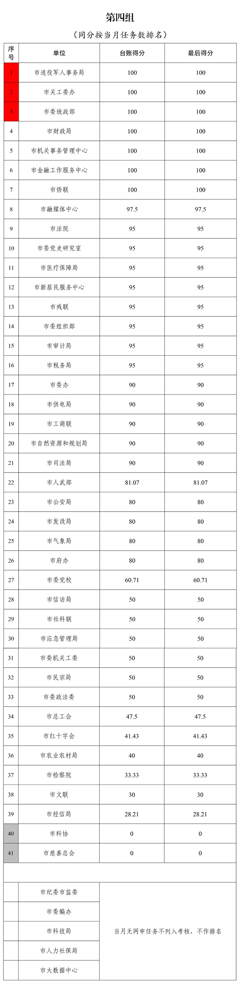 第四组:红榜单位市退役军人事务局、市关工委办、市委统战部,黑榜单位为市科协、市慈善总会。