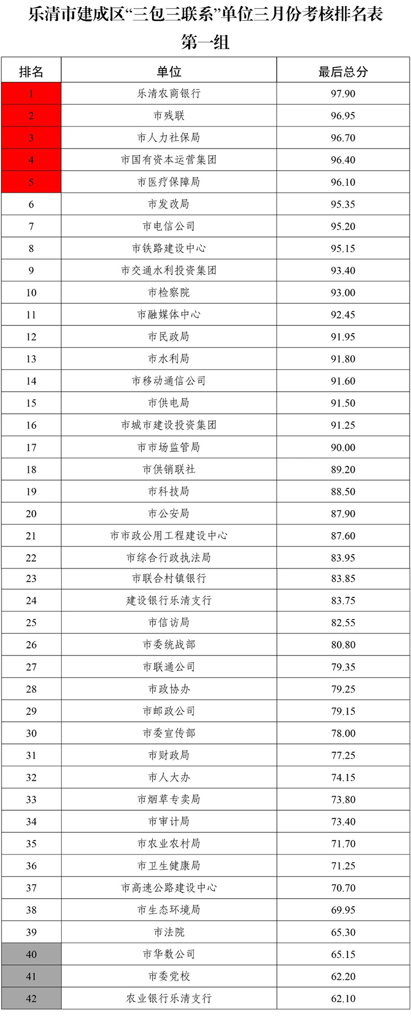 第一组红榜单位为乐清农商银行、市残联、市人力社保局、市国有资本运营集团、市医疗保障局;黑榜单位为市华数公司、市委党校、农业银行乐清支行。