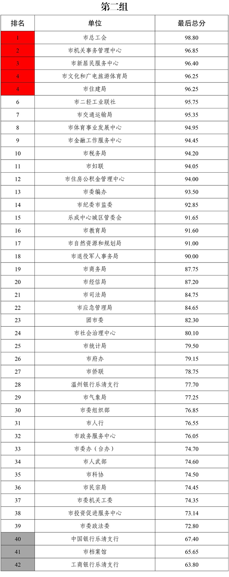 第二组红榜单位为市总工会、市机关事务管理中心、市新居民服务中心、市文化和广电旅游体育局、市住建局;黑榜单位为中国银行乐清支行、市档案馆、工商银行乐清支行。
