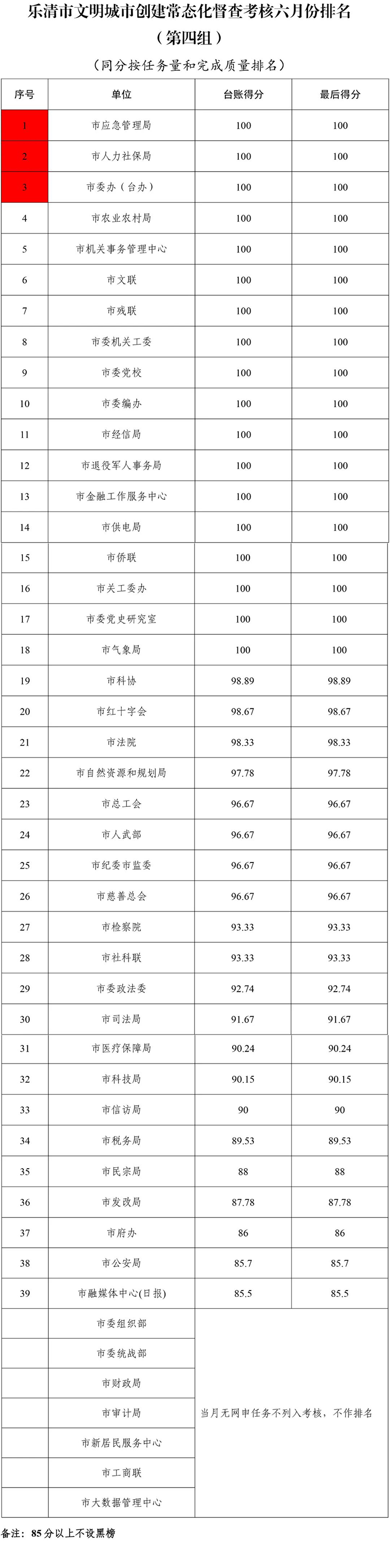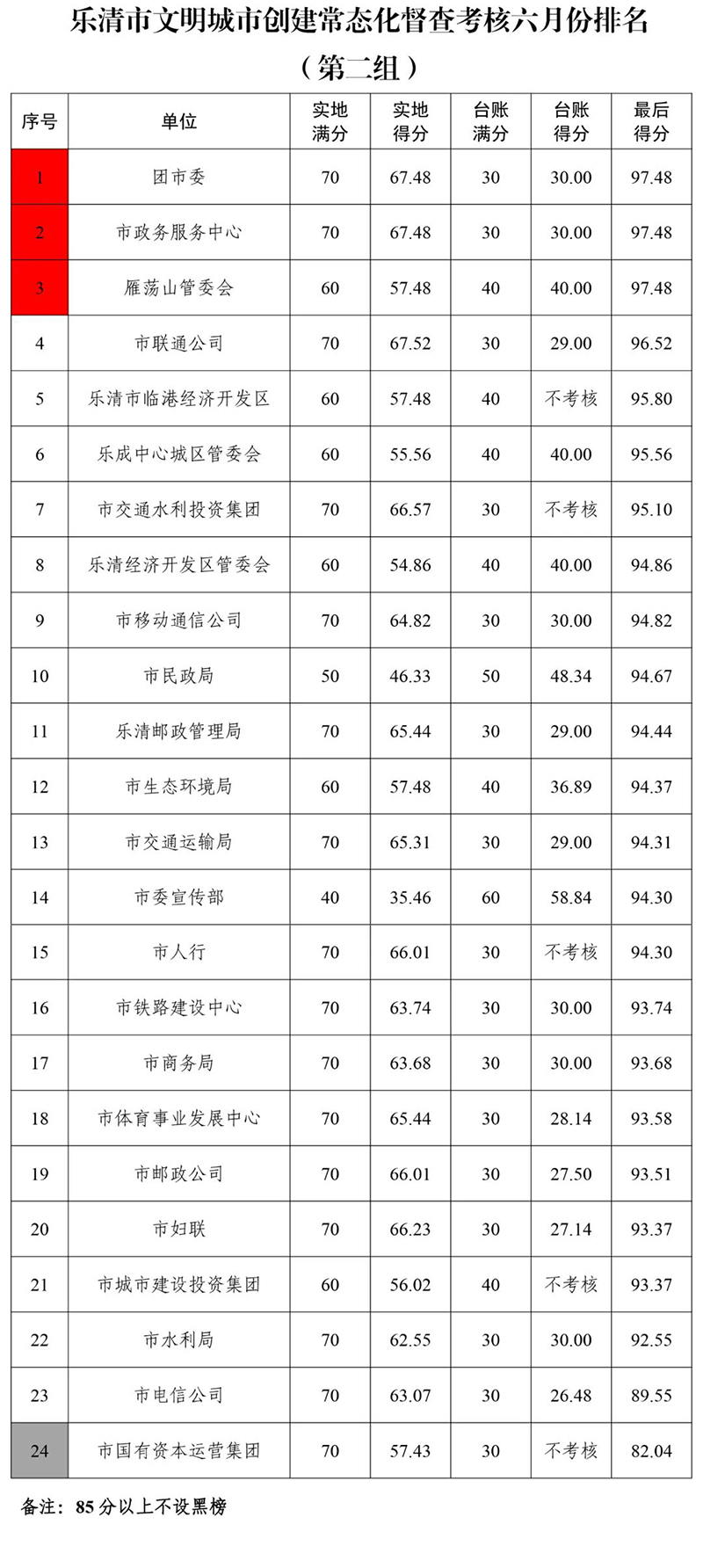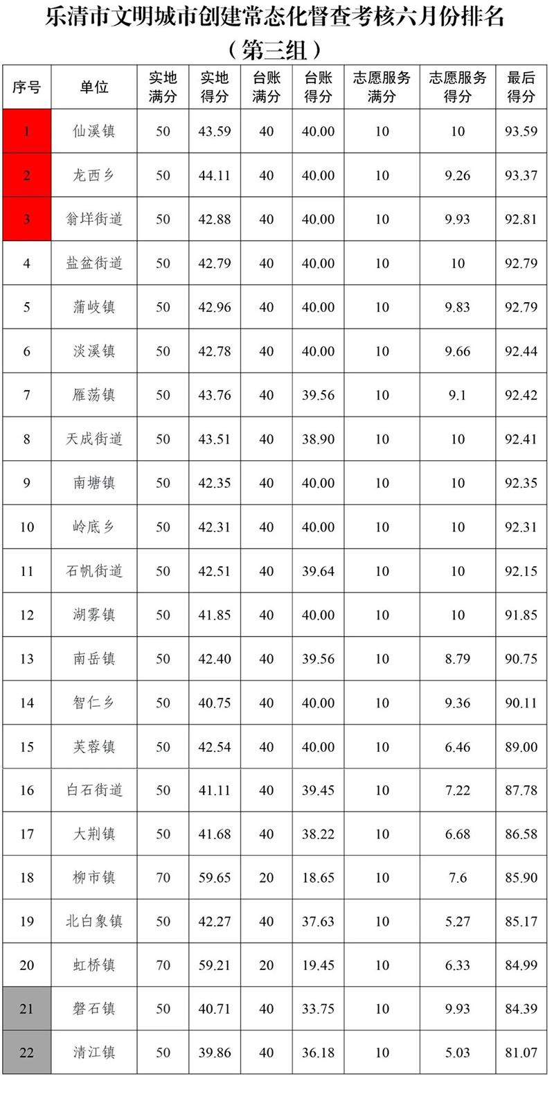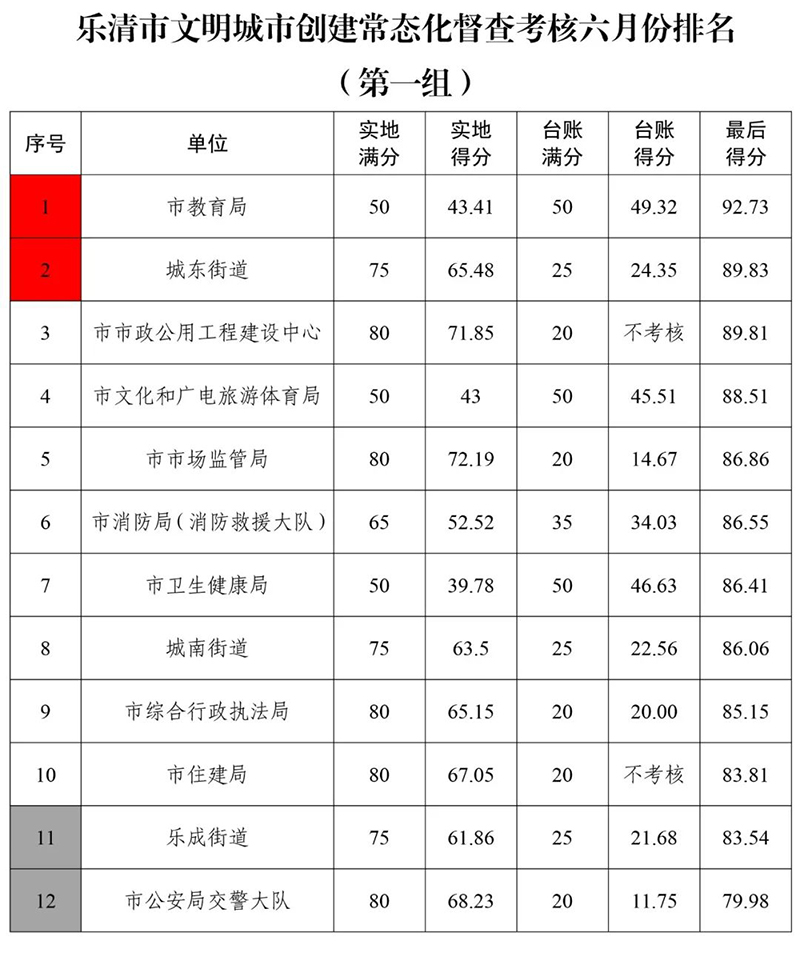 根据《2023年乐清市文明城市创建实地常态化督查考评办法》(乐创文〔2023〕1号)要求,2023年六月份市创建办对79个职能部门和25个乡镇(街道)开展实地测评和台账申报,发现的问题已通过《乐清市创建全国县级文明城市信息管理系统》进行反馈,请各责任单位举一反三抓好整改并按时反馈整改情况。督查考评按分组排名,排名靠前的予以红榜激励,排名靠后的予以黑榜惩戒,现将结果公布如下: