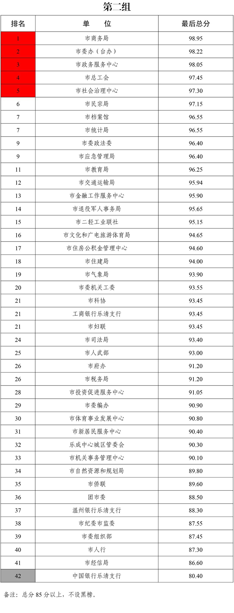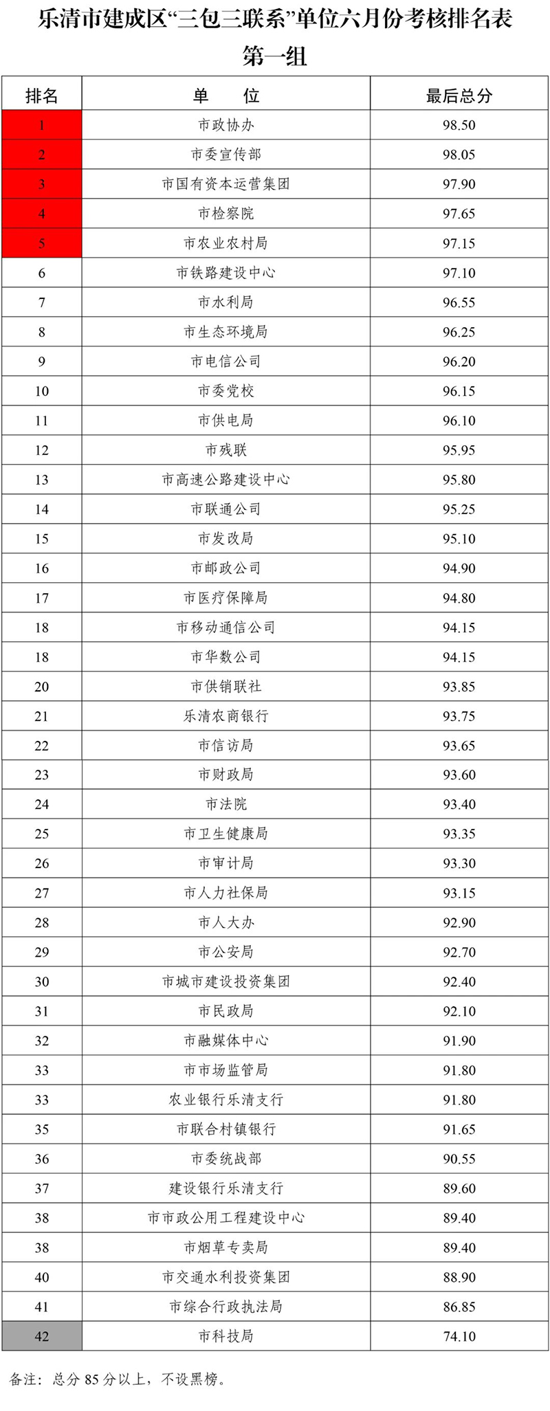 第一组红榜单位:市政协办、市委宣传部、市国有资本运营集团、市检察院、市农业农村局;黑榜单位:市科技局。第二组红榜单位:市商务局、市委办(台办)、市政务服务中心、市总工会、市社会治理中心;黑榜单位:中国银行乐清支行。