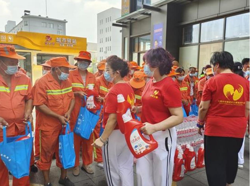 本次活动还邀请了夏日高温依旧坚守在一线岗位的环卫工人们,为他们准备了绿豆汤、凉茶等消暑饮品,还送上防暑礼包,并安排理发、按摩等项目,让他们感受到温暖与关怀。