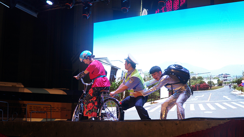 晚上7点,南虹广场上人头攒动,晚会吸引许多市民到场观看。主题演出中,音乐情景剧《时空之爱2018》把生活中的一些交通陋习以情景剧的形式巧妙形象地体现出来,电动车闯红灯、行人跨越护栏乱穿马路、斑马线礼让行人、开车使用手机、非法改装车等,让观众在欣赏节目的同时,反思自己的出行情况,宣传号召市民遵守交通规则、文明出行,节目新颖生动,让每位交通参与者找到了共鸣。
