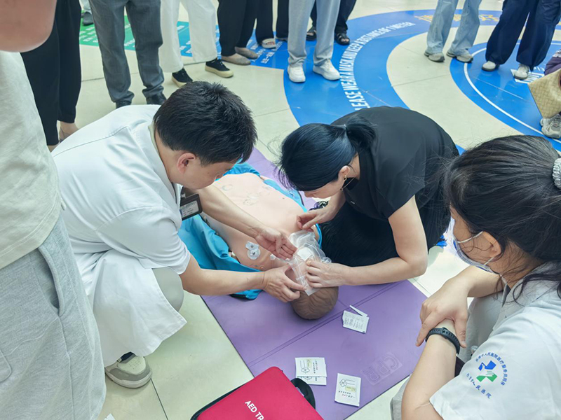 “双手掌根叠放于两乳头连线中点,垂直向下按压,深度5-6厘米,频率每分钟100-120次。”在心肺复苏(CPR)教学区,医护人员以人体模型为教具,现场演示按压与人工呼吸的配合节奏,随后手把手指导群众实操,并及时纠正按压位置、按压速度等方面存在的问题,确保大家掌握核心要领。