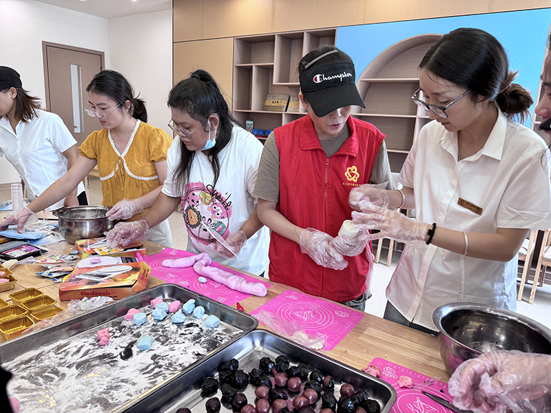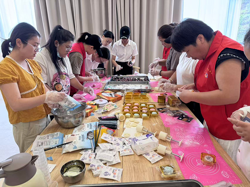 活动现场,志愿者们围在摆满食材与工具的桌前,热情高涨。大家戴着手套,分工协作,揉面团、包馅料、压模具,忙得不亦乐乎。在志愿者们的巧手下,一个个造型精致、色彩缤纷的月饼逐渐成型。