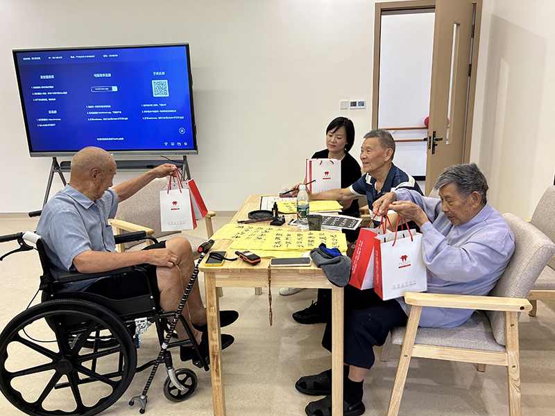 在另一处,颐养中心的老人们围坐在一起,桌上铺着写满字迹的纸张,他们或交流,或期待着美味月饼的到来。当志愿者们将包装好的、印有“中秋”字样的精美月饼送到老人们手中时,老人们脸上洋溢出幸福的笑容,现场充满了温馨欢乐的节日气息。