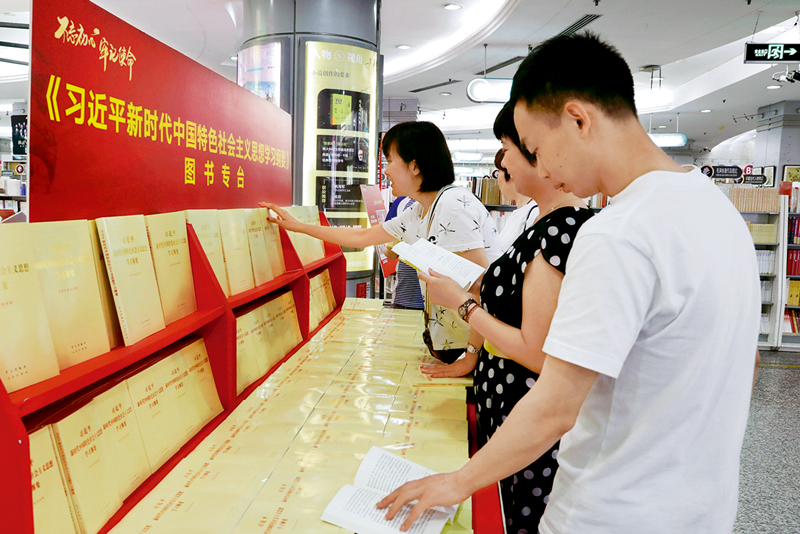 2019年6月,中共中央发出关于印发《习近平新时代中国特色社会主义思想学习纲要》的通知, 要求各级党委紧密结合“不忘初心、牢记使命”主题教育,把《纲要》纳入学习计划, 作出周密安排,开展多形式、分层次、全覆盖的学习培训。图为读者在西单图书大厦喜读《纲要》。 徐瑾/摄